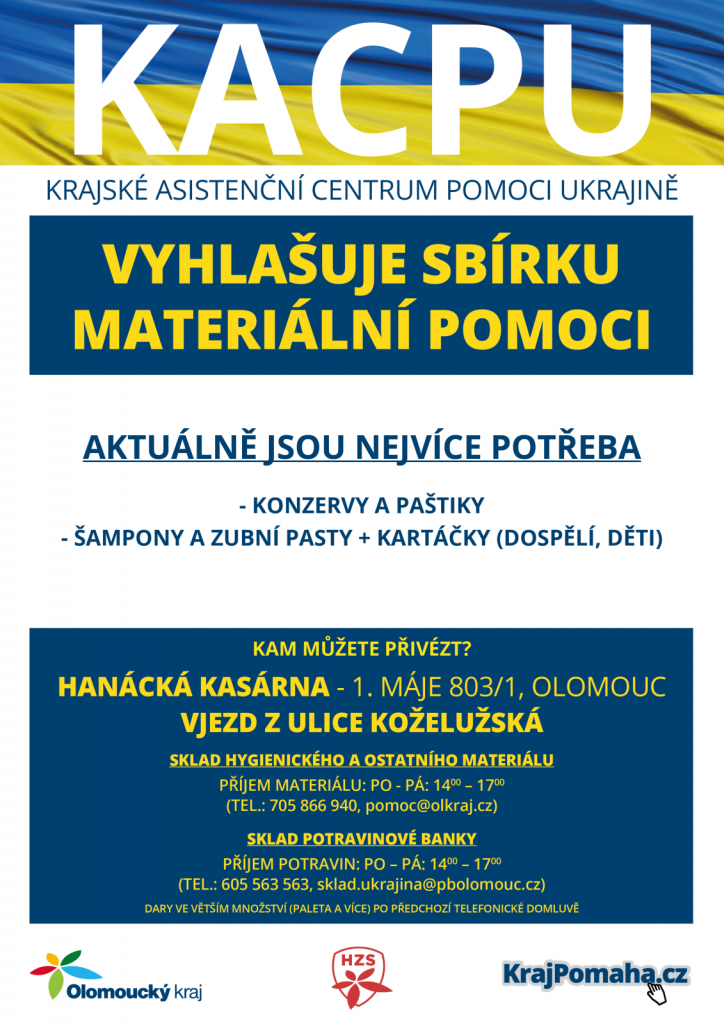 Byla vyhlášena sbírka materiální pomoci pro uprchlíky, kteří prochází registrací v asistenčním centru v Hanáckých kasárnách v Olomouci (KACPU). V přiloženém letáku jsou uvedeny potraviny a hygienické prostředky, které jsou aktuálně potřeba doplnit pro další kompletaci balíčků pomoci (konzervy, paštiky, šampony, zubní pasty a kartáčky pro děti a dospělé).