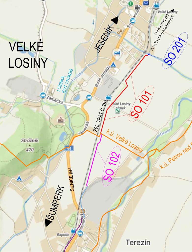 Nově plánovaná cyklostezka plynule naváže na stávající smíšenou stezku v Rapotíně, jež je v současné době ukončena výjezdem z parku u nádraží na místní komunikaci Za Hutí. Nový úsek povede podél železniční trati v katastrálním území Rapotína směrem do Velkých Losin (viz přiložená situace).