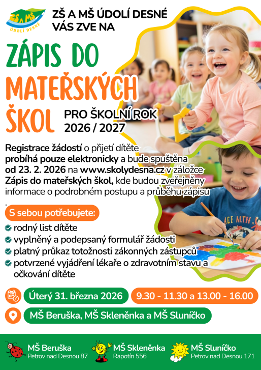 Zápis do mateřských škol proběhne prezenčně v úterý 31. března 2026 v čase 9:30–11:30 a 13:00–16:00 v prostorách MŠ Beruška, MŠ Skleněnka a MŠ Sluníčko.