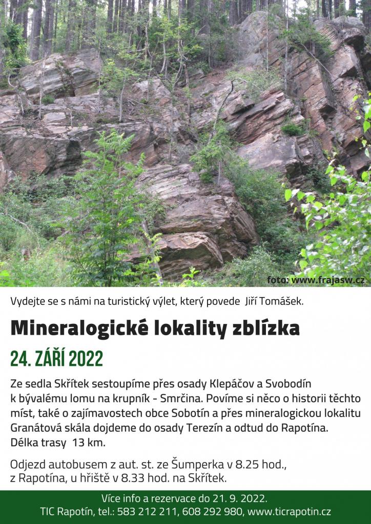 Ze sedla Skřítek sestoupíme přes osady Klepáčov a Svobodín k bývalému lomu na krupník - Smrčina. Povíme si něco o historii těchto míst, také o zajímavostech obce Sobotín a přes mineralogickou lokalitu Granátová skála dojdeme do osady Terezín a odtud do Rapotína.