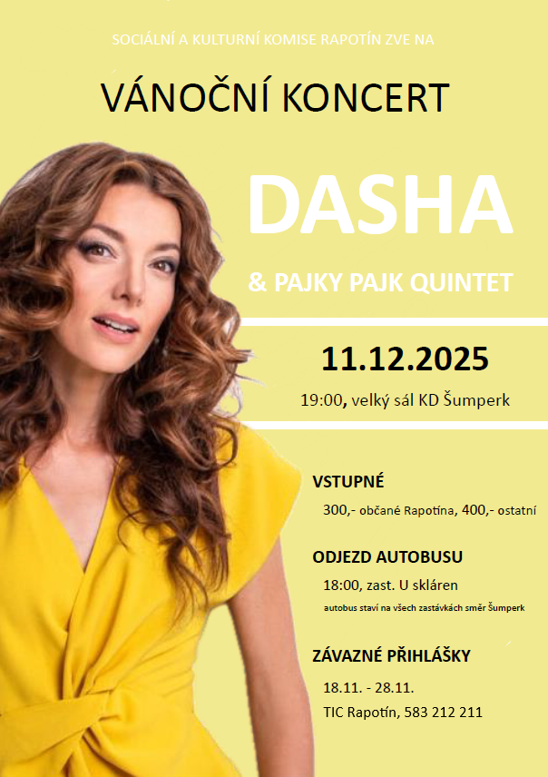 Vánoční koncert se uskuteční 11. prosince 2025 v 19:00 ve velkém sále KD Šumperk. Vstupné činí 300 Kč pro občany Rapotína a 400 Kč pro ostatní.
